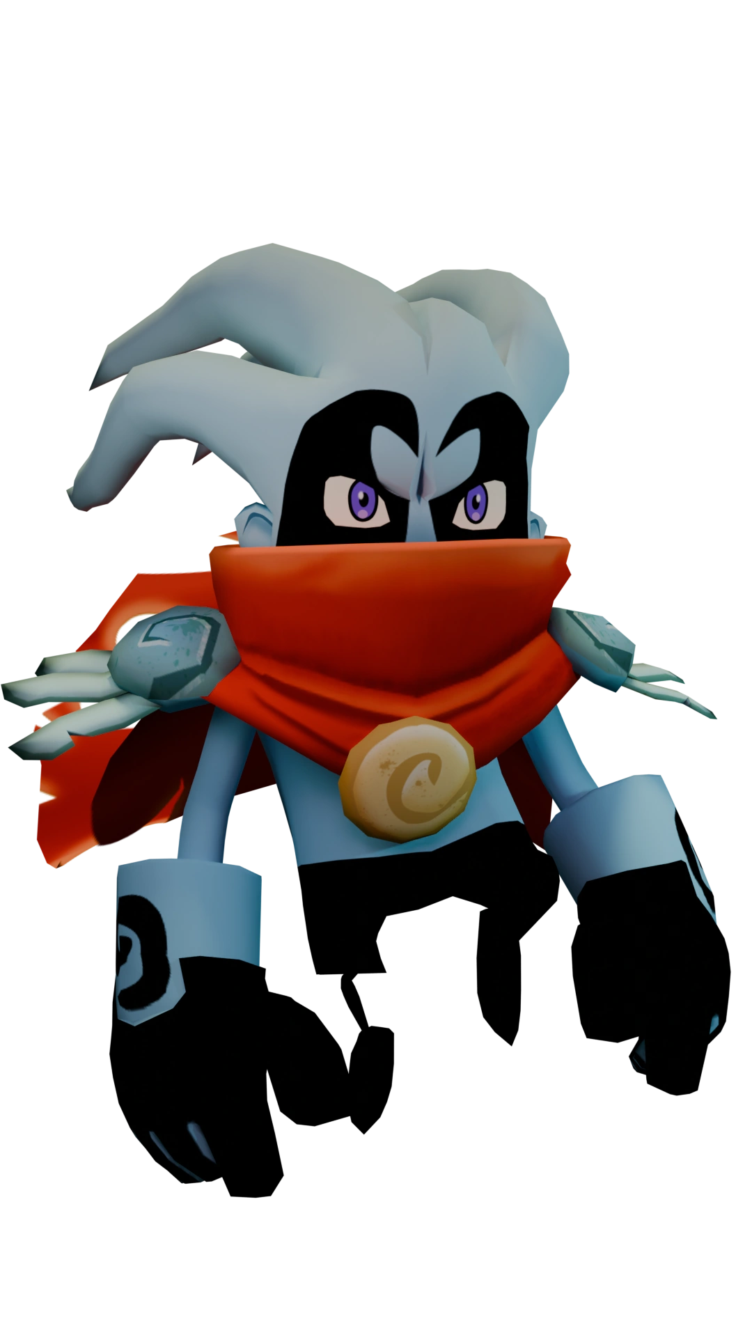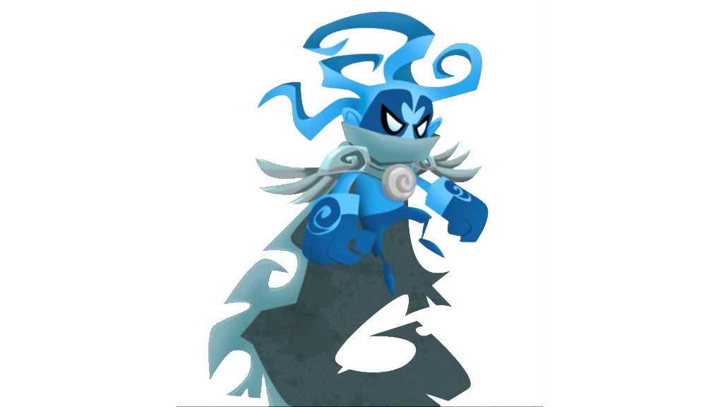 Nimbus is a violet-eyed, black and light blue air elemental with large gauntlets, a red tattered cape, a red scarf, metal wing-shaped shoulder pads, and a gold medallion bearing the Wind Warrior emblem. The top of his head consists of four head-tails.