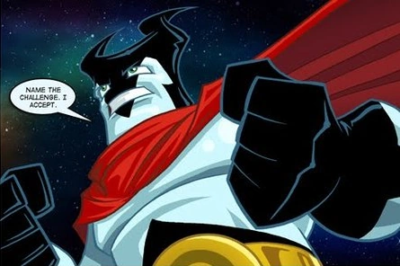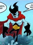 Stratos is a muscular light blue and black air elemental with a red cape, horns, and a golden belt donning the Wind Warrior emblem in the center. He has green eyes, black legs and large black forearms.